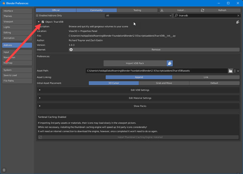 Once installed, check the box (indicated by the arrow) to enable the addon.